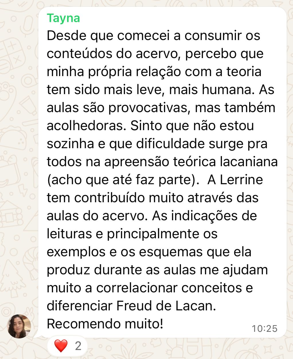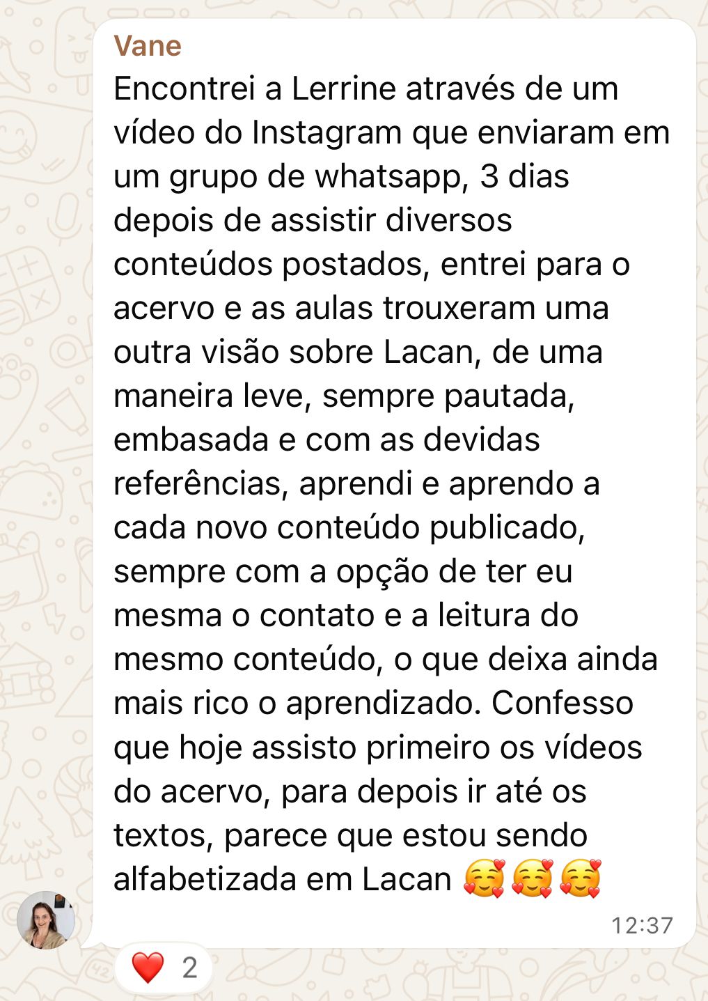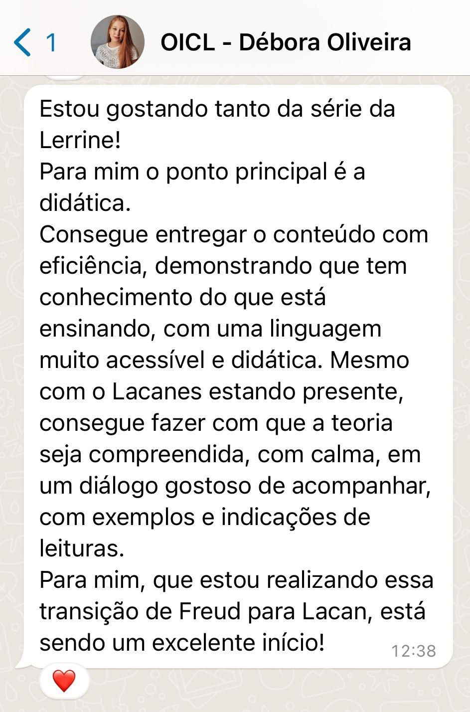 É um espaço vivo da transmissão psicanalítica de Lerrine Mewes — os conteúdos são resultados das construções que a Lerrine faz em torno dos conceitos, axiomas, álgebras, grafos, esquemas e matemas do ensino de Jacques Lacan, pensadas especialmente pra quem está no início de seu percurso.